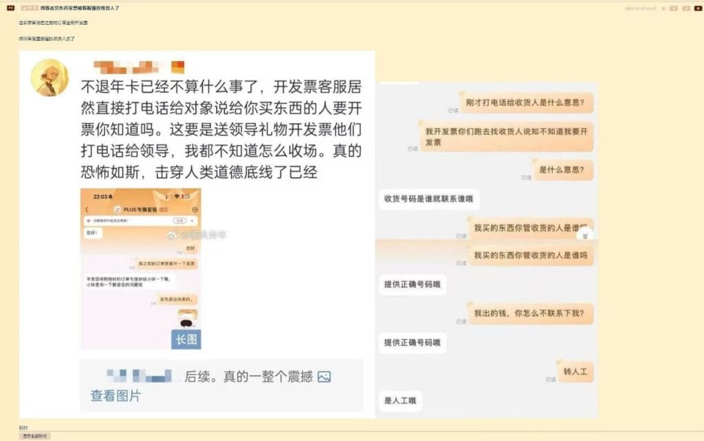 具体怎么击穿的?京东客服是可以看到对面的昵称的,而且在开发票后京东会专门为收货人打电话通知开发票一事,这意味着京东只要乐意,它就可以拿着客户数据做任何你想得到的和想不到的操作,同时意味着你挂在平台的姓名、住址和电话也将变得不再安全。