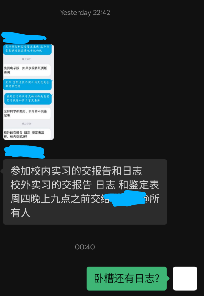 幸好吸取了上学期生产实习的教训,我当时因为要去AOSCC就把找工作时间推了一下,然后发现我正好避开了一个大雷:生产实习校外实习需要交日志、答辩报告、答辩PPT……